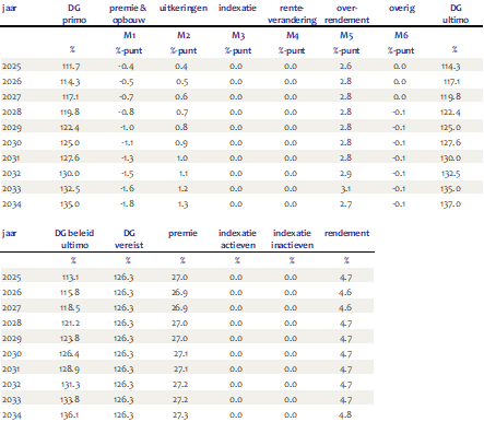 In het bovenste deel van de tabel staat hoe de dekkingsgraad zich in het herstelplan van jaar tot jaar ontwikkelt. In het onderste deel staan de gebruikte uitgangspunten.